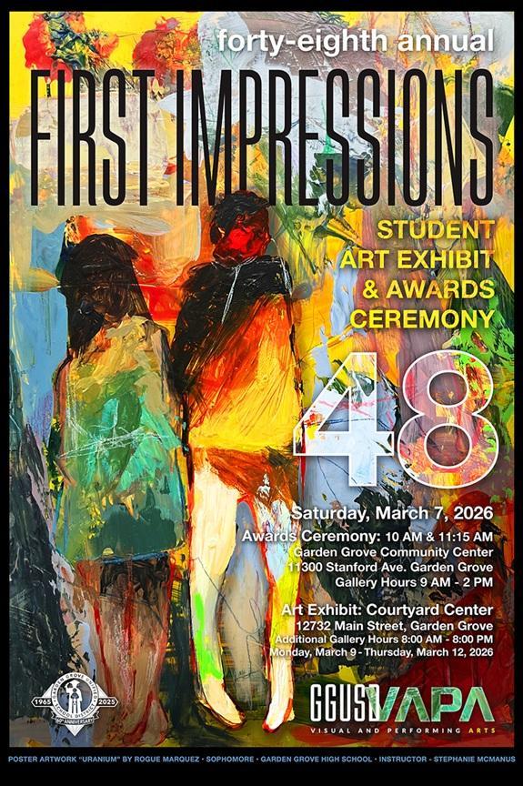 The 48th Annual GGUSD First Impressions Awards Ceremony will be held on Saturday, March 7th at 11:15 AM. The artwork will be exhibited in the Garden Grove Courtyard Center gallery on Saturday from 9 AM to 2 PM. If you can’t make it on Saturday, the gallery will be open from Monday, March 9th through Thursday, March 12th from 8 AM to 8 PM. You may also visit our very own Art Gallery in the 400 building throughout the year to see the awesome work of our Lobo artists.
